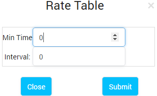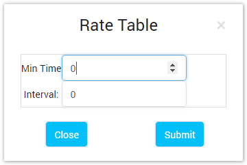 Is used to add Min Time and Interval. Click on this icon, the new form will pop-up: Min Time - Minimum chargeable duration. If min time is 6 sec and someone calls only for 3 sec. The call will get charged for 6 sec. Interval - This is the interval for billing. If you set it 6 sec. Then billing will be based on every 6 sec. If you call for 11 sec, but as billing interval is 6 sec. It will be charged for 12 sec. | |