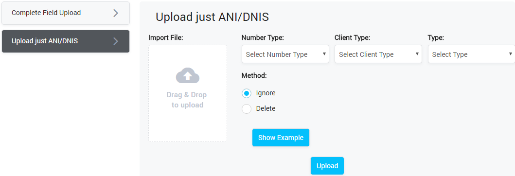 If the user wants to add many ANI/DNIS for a carrier, Upload Just ANI/DNIS part will help to do it. Click on Upload Just ANI/DNIS button, this part will appear: